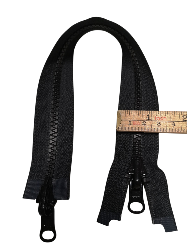 Högkvalitativt YKK-vändbart tvåvägsvislon blixtlås i svart med robust metallösare (löpare). Detta tvåvägsdragkedja / tvåvägsblixtlås öppnas från båda håll och ger flexibel användning för jackor, skaljackor, väskor, fodral och andra sömnadsprojekt.